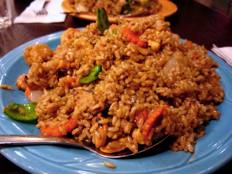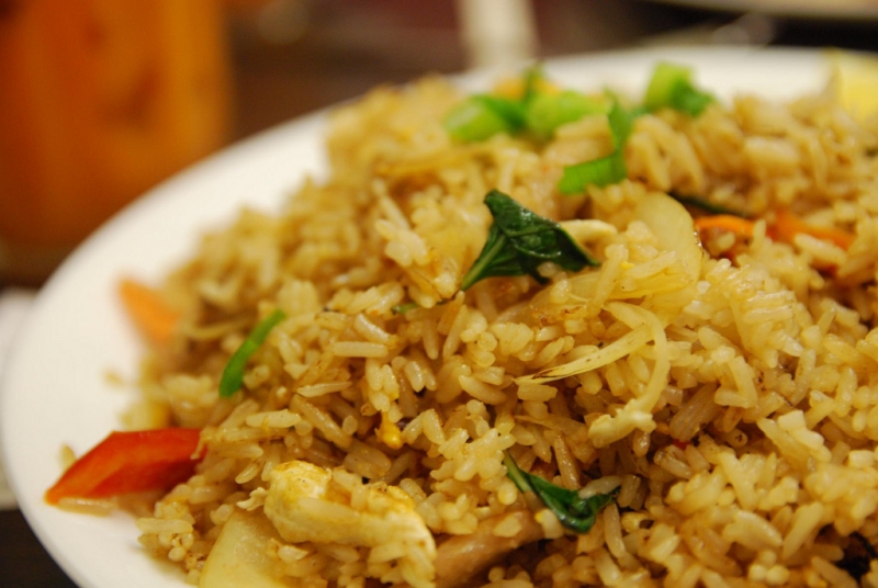 Megfőzzük a rizst a csomagoláson látható utasítás szerint és félretesszük. Megmossuk a csirkehúst, megszárogatjuk, majd vékony csíkokra szeleteljük. Megmossuk a cukorborsót és a chilipaprikát, majd felszeleteljük azokat Felforrósítunk olajat a wokban és a húst megsütjük benne, majd a laskagombaszószt és a sambal oekeket hozzáadjuk. Beletesszük a wokba a felszeletelt cukorborsót, chilipaprikát és a szójacsírát, majd ezeket szintén megpirítjuk. A rizst hozzáadva tovább sütjük. Villával elkeverjük a tojásokat, majd hozzáadjuk a rizshez. Sütjük amíg a tojás meg nem szilárdul, és "megköti" kissé a rizst. Sült hagymával meghintve tálaljuk.